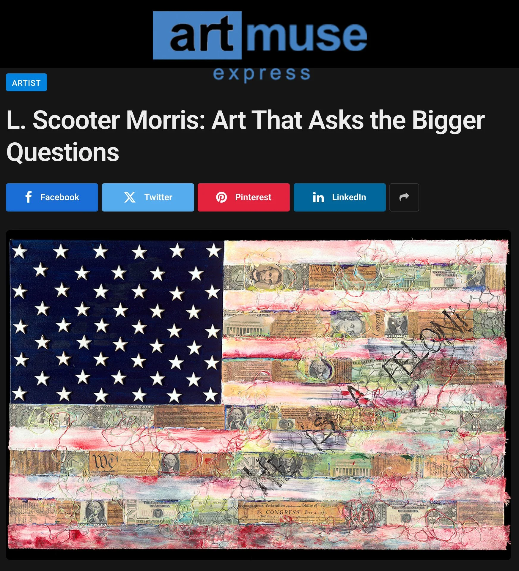 So Scooter Morris’ We Are the People series, consisting of American flags she created and then augmented, elicits emotional responses in waves: The viewer experiences a visceral reaction to the Stars and Stripes, then focuses on the Santa Fe artist’s pointed political messages. The series is exhibited through August 17 at Aurelia Gallery.